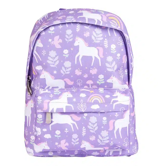 De kleine, paarse rugzak met eenhoorns, bloemetjes en regenbogen is ideaal om mee te nemen naar school of naar de kinderopvang. De peuterrugzak heeft een ruim hoofdcompartiment en een vakje met rits voorop. Het rugzakje is daarnaast voorzien van gewatteerde schouderbanden en rugpaneel. De rugzak heeft ook een borstriem, zodat hij niet zo snel van de schouders afzakt.