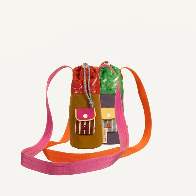 Stay hydrated everywhere you go! Keep your bottle close with this bottle bag. It come in skate ramp with a metallic shimmer on top, the rugby red coloured handle is the finishing touch. On the front you find a small pocket and on the top you can close the bag with a drawstring.