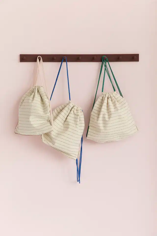 Een tas met trekkoord en een handgetekend patroon, inktblauwe hengsels en een sprankelende glittertouch. De body is gemaakt van natuurlijk katoen en de voering is waterdicht.