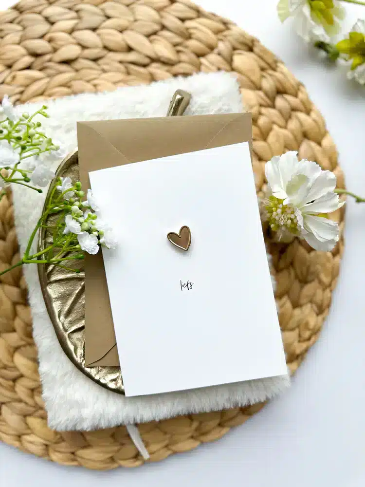 Een dubbele kaart in het wit met het allerliefste hartje als pin op de voorkant. Dit kaartje is zo ontzettend schattig!